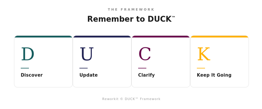 DUCK™ is a framework for managing up effectively. It stands for: Discover, Update, Clarify, and Keep It Going.